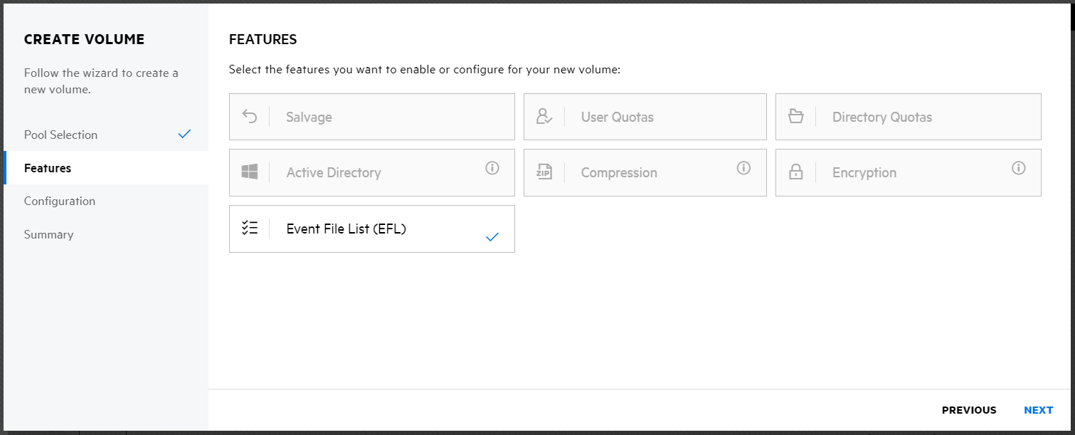 On the FEATURES page, select the features you want to enable for the new volume, and click NEXT.
