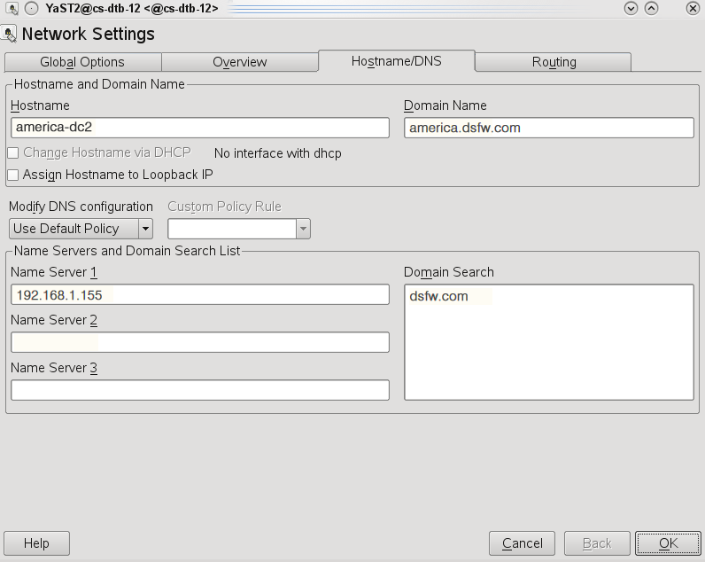 Open YaST>Network Devices>Network Settings. Select the Hostname/DNS tab.