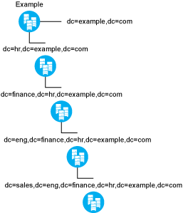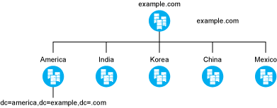 The scenarios explained here are only indicative of the various ways in which you can deploy DSfW server in your environment. Here the tree structure overlaps with the DNS namespace. For instance, the domain example.com will be mapped to dc=example,dc=com FQDN.