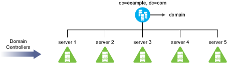 In Figure 5-1 the example.com domain is served by 5 domain controllers.