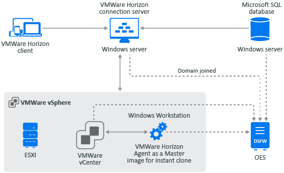 For the integration of DSfW with VMware, VMware components such as VMware Horizon connection server, database, and golden image were joined to DSfW domain. Pointed vCenter to DNS of DSfW domain and added compatible ESXi as a host in vCenter for the cloning.
