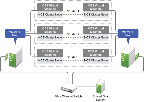 In Figure 3-3, the NCS cluster nodes are all virtual machines. Each node is hosted on a different VMware host. All nodes are running the same version of the OES operating system.