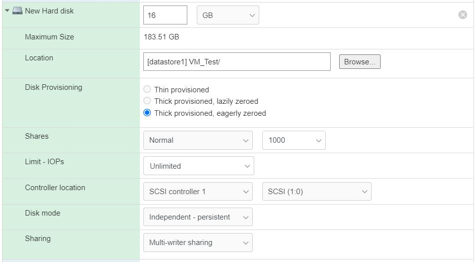 Disk Provisioning: Select Thick provisioned, eagerly zeroed. Other options are not recommended.