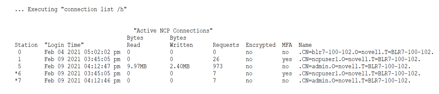 Displays the NCP Server configuration information such as the server name, server version, product version, NCP version, mixed-mode paths status (yes/no), and commit files status (yes/no).