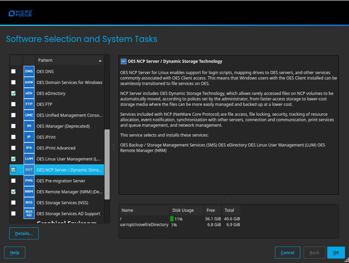 When you select OES NCP Server / Dynamic Storage Technology, the following additional OES Services options are automatically selected: