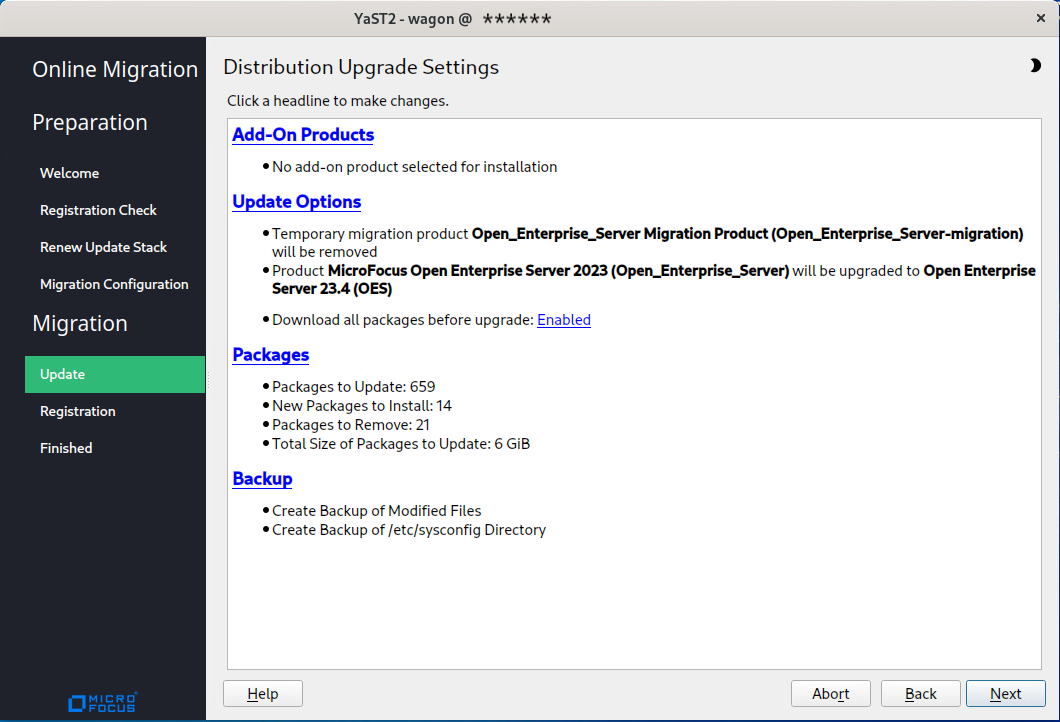 WARNING:If Product MicroFocus Open Enterprise Server 2023 (Open_Enterprise_Server) will be upgraded to Open Enterprise Server 23.4 (Open_Enterprise_Server) is not displayed, click Abort and roll back the server.
