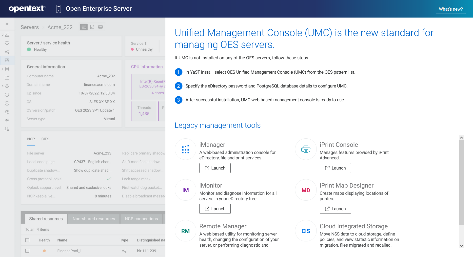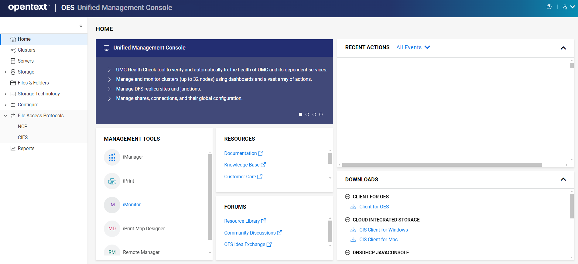 If UMC pattern is not installed, you are directed to the OES welcome page, which consists of the steps to install and configure UMC. Only Legacy management tools can be accessed from the OES welcome page. You can use the Application Delivery Marketplace to download the client softwares.