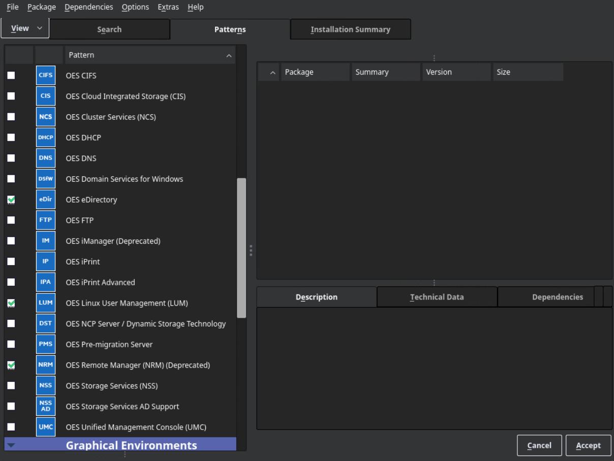IMPORTANT:To install any of the OES patterns, you must customize the software selections. If you don’t make any selections, only the base OES packages are installed. However, you can install any of the patterns after the base OES installation is complete. See Installing or Configuring OES Services on an Existing OES Server.
