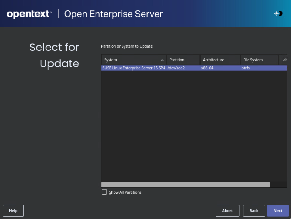YaST tries to determine the correct root (/) partition. If there are several possibilities, or if YaST can’t definitely determine the correct root partition, the Select for Update page displays.