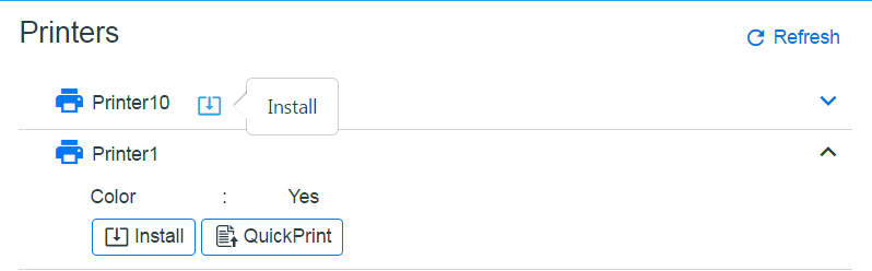 Installing a Printer: To install a printer, hover the cursor on the printer and click . You can also expand a printer to view the printer properties and then click Install. The installation of secure and WalkUp printers is controlled through ACLs set for that user.