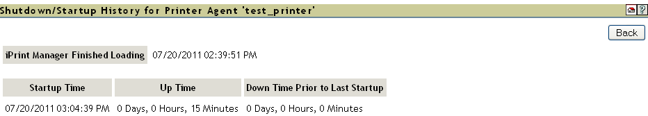 Displays a history of the startup and running times for this Printer Agent since the last time the iPrint Manager was loaded. When a Printer Agent has been restarted many times, it usually indicates that a problem exists and warrants further investigation. This link appears only if you have manager or admin rights to the Printer Agent.