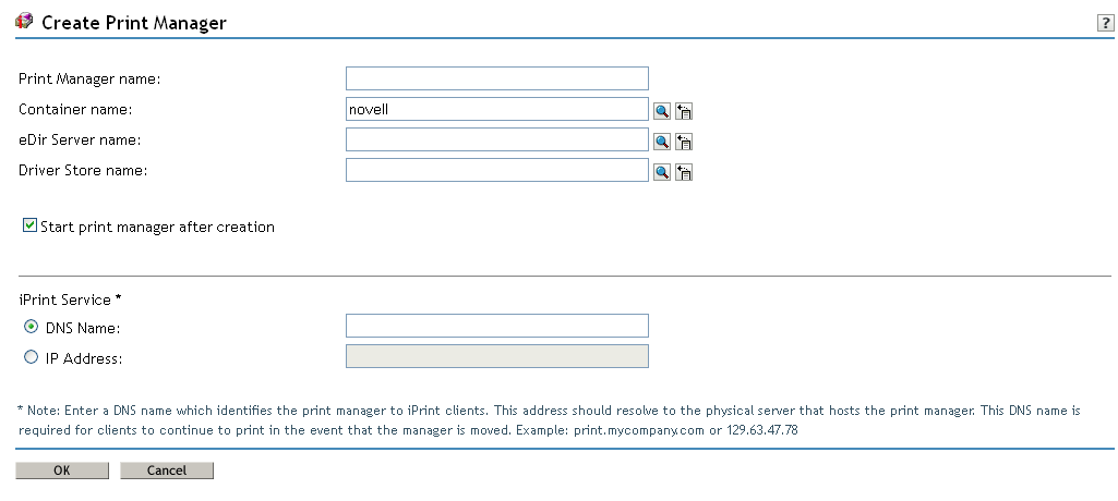 IMPORTANT:Based on the Print Manager configuration, the Print Manager creates a URL for each printer. When you create the Print Manager, you can specify a DNS name or an IP address for the iPrint Service of the same server where you are creating the Print Manager. You should use the DNS name because if the IP address changes, users must delete and reinstall the printers.