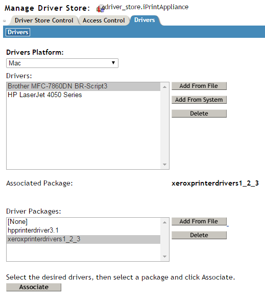 Click Associate. This associates the selected driver to the package. When a user installs the printer, the driver and its associated files from this package are installed on the workstation. If the dependent files are missing, the printer installation fails.