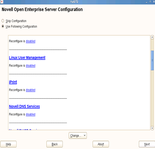 5. To change the default configuration settings for iPrint, click the iPrint service, or click Next to continue with the default configuration.