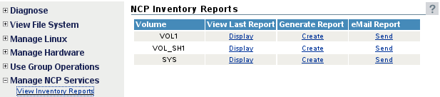 Select Manage NCP Services > Volume Inventory Reports, locate the NSS volume in the list, then click Create in the Generate Report column for the volume.