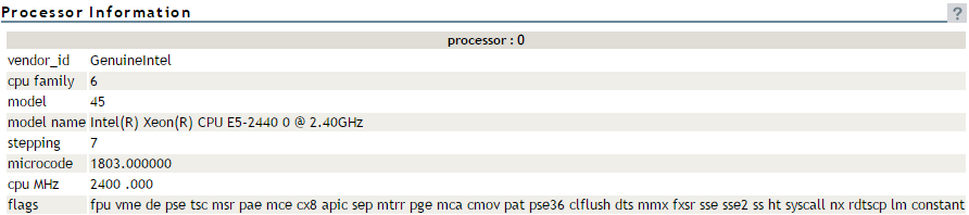 Clicking the View Processors link under the Manage Hardware heading in the navigation frame displays the Processor Information page. On this page you can view information about each processor on this host.