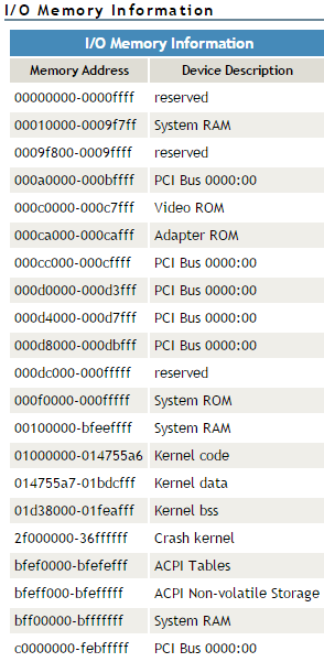 Clicking the IO Memory Information link under the Manage Hardware heading in the navigation frame displays the I/O Memory Information page, which includes the following: