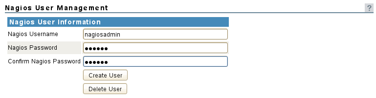 Create a Nagios user name and password, or delete a Nagios user. You can also use this option to create the user name with a different password. For more information, see Section 7.5, Managing Nagios Users. |