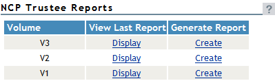 3. On the NCP Trustee Reports page, locate the NSS volume in the list, then click its Create link in the Generate Report column.