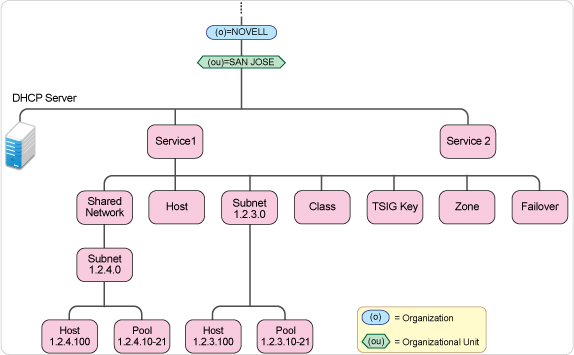 The DHCP Server object and DHCP service object can be created in the context of an Organization (O),Organizational Unit (OU), Locality (L), or Country (C).