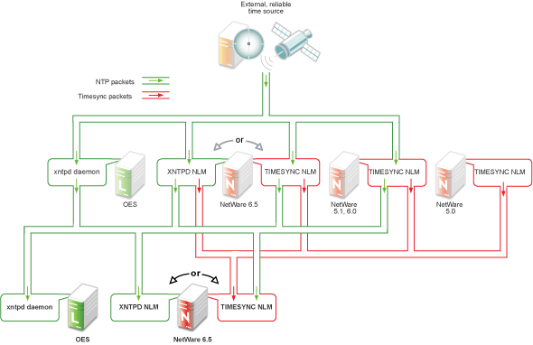 Figure 10-5 shows how OES servers can function as time providers to other OES servers and to NetWare servers, including NetWare 4.2 and later.