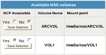 If the volume is in the Available NSS Volumes list and its NCP Accessible value is set to No, the volume’s NCP/NSS binding is disabled.