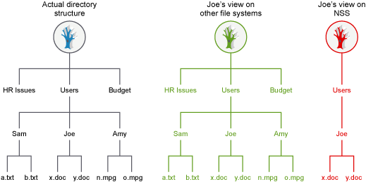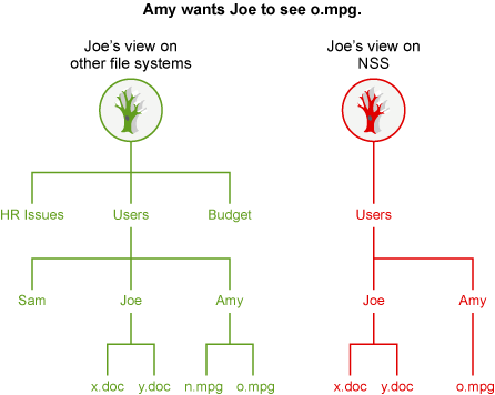The OES Trustee Model also controls visibility into the file system. For example, the user Joe is made a trustee of the Joe folder, and has access only to files in the Joe folder. Figure 5-6 demonstrates how Joe’s view of the file system differs if the files are on a volume where the Trustee Model is applied as compared to the ACL (Access Control Lists) method on other file systems.