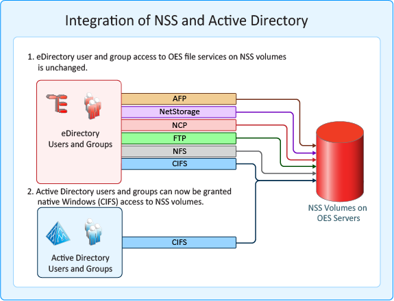 Beginning with OES 2015 or later, you can provide Active Directory (AD) users with the ability to seamlessly access NSS resources and administer them. AD users and groups do not need to move to eDirectory; NSS resources can be accessed by both AD and eDirectory users at the same time.