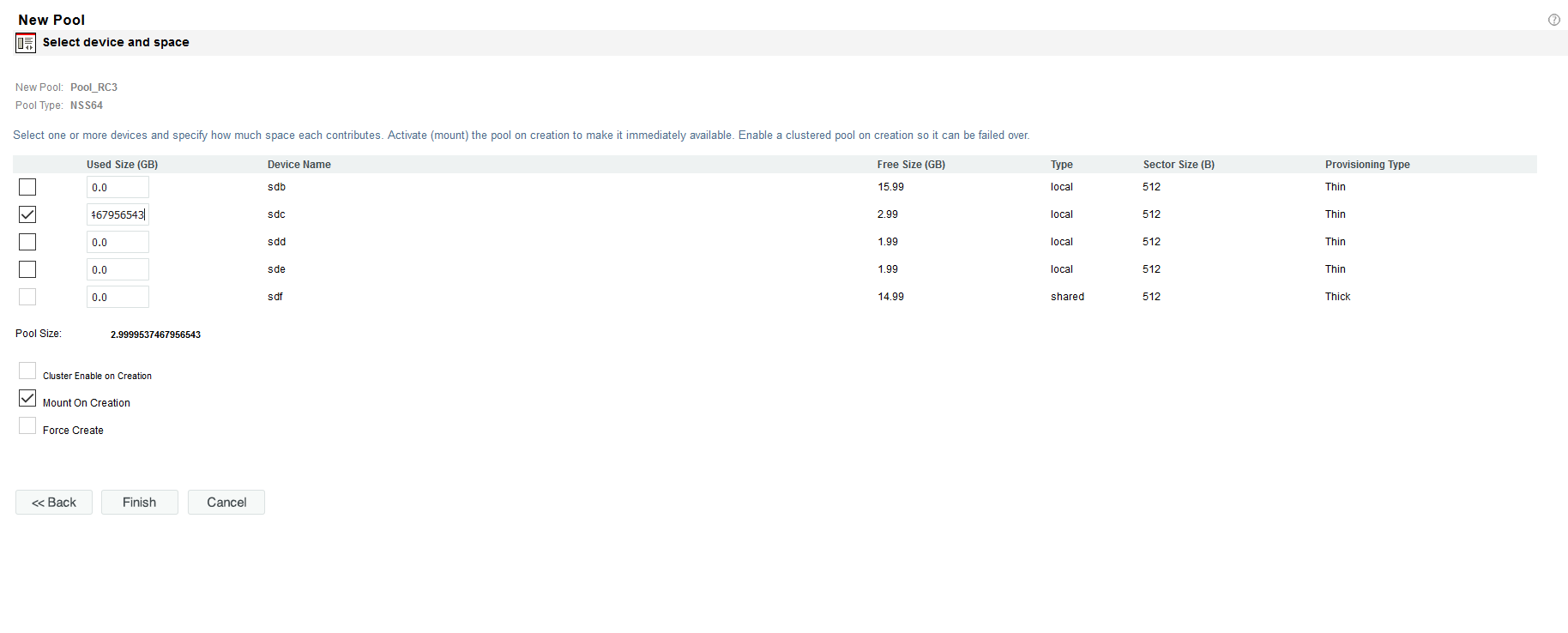 If the selected device is shareable, the Cluster Enable on Creation check box is automatically selected so the pool can be shared in a cluster configuration. Deselect the check box if you do not want to cluster-enable this pool for sharing.