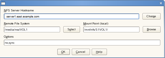 2. In NFS Server Hostname, specify the remote server where the volume resides. Type the fully distinguished name (such as servername.ou_context.o_context.com), or click Choose, select the NFS server from a list of servers, then click OK.