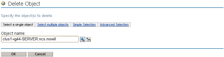 2. On the Delete Object page, browse to locate and select the resource’s NCS:NCP Server object (such as clus1-vg44-SERVER.ncs.novell), then click OK.