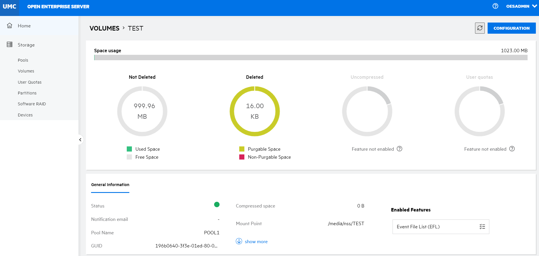 You can view the details of a volume like space usage, general information of the volume, and enabled features on the volume dashboard page.