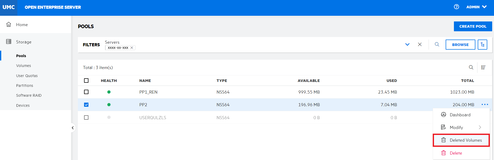 On deleting a volume, NSS removes it from the pool. The Deleted Volumes option on the Pools page displays a separate Deleted Volumes page where you can purge or salvage the deleted volumes for the pool. This option is only available if the selected pool has deleted volumes in it.
