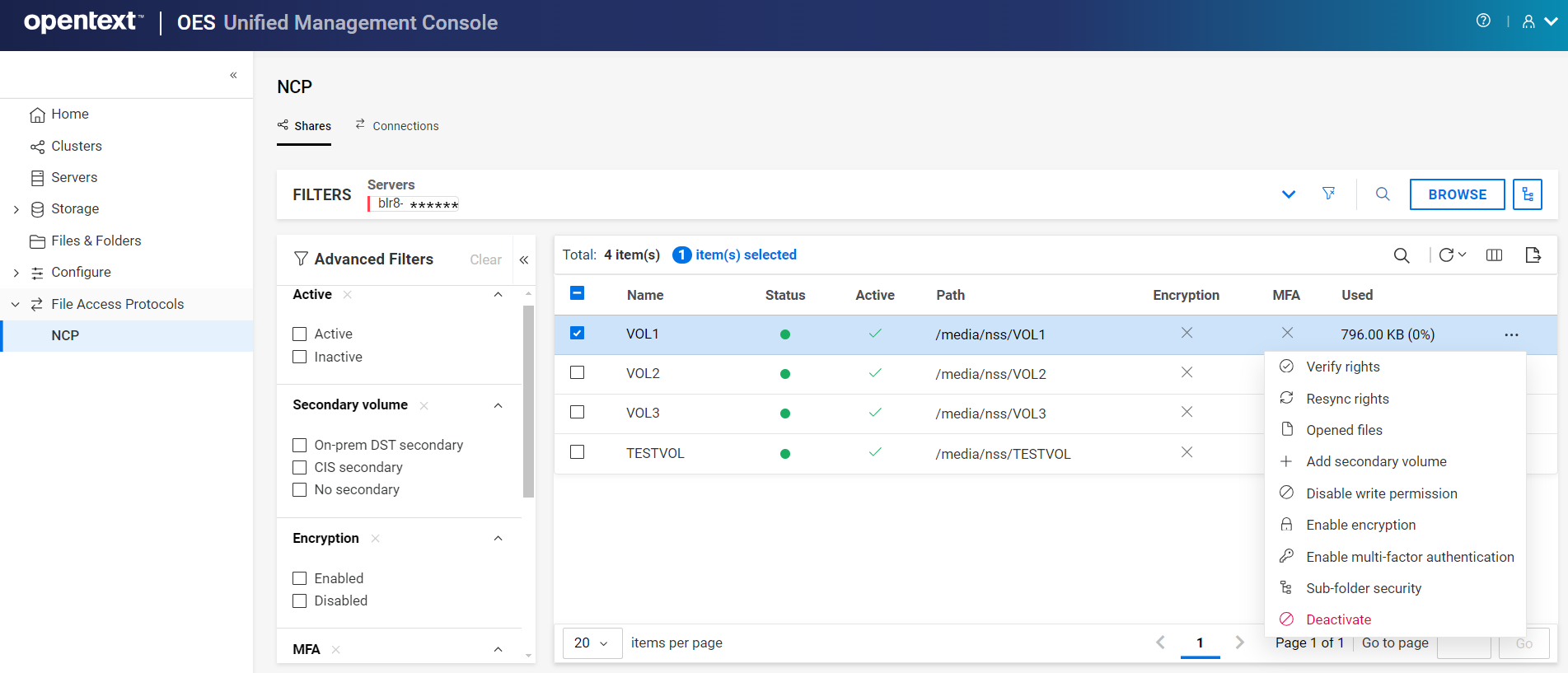 The directory and file access are controlled with the OES trustee model for file system trustees and trustee rights. Users access NCP volume data using the Client for Open Enterprise Server software on their Windows or Linux workstations.