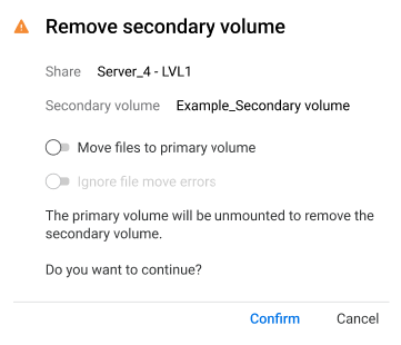 Move all files from the secondary volume to the primary volume before removing the secondary volume.