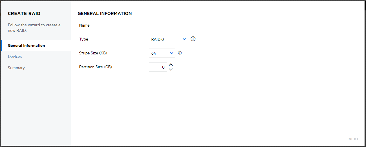 3. On the GENERAL INFORMATION page, specify the RAID details, and click NEXT.