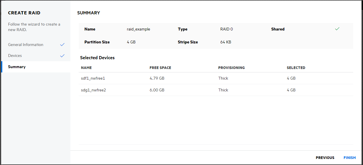 NOTE:If the specified partition size exceeds the amount of free space available on the physical devices, the RAID creation fails and returns an error message.
