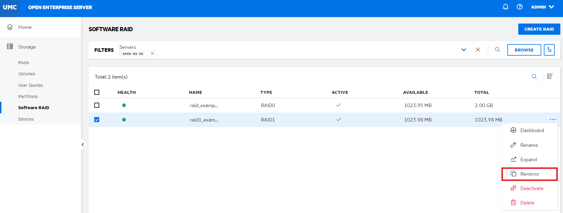 Click CONFIRM to remirror the selected RAID device.