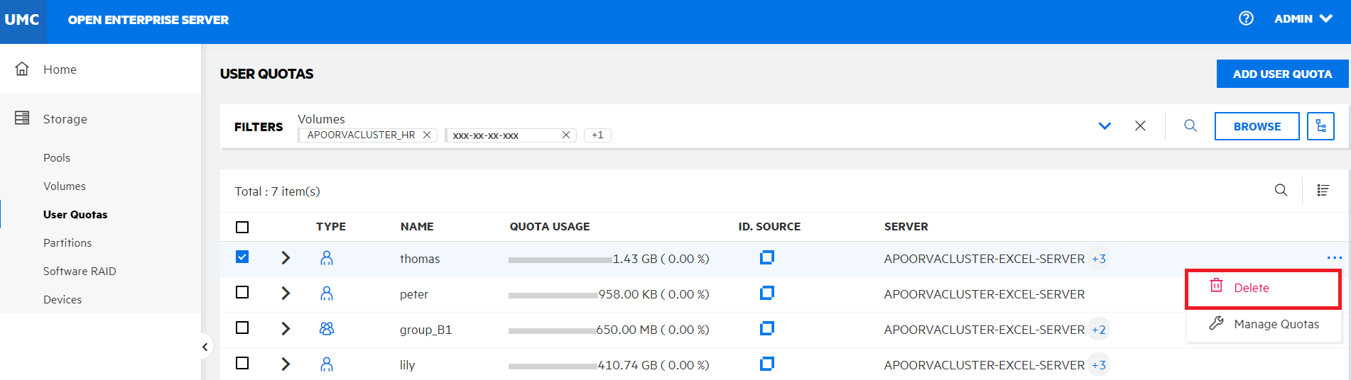 Storage > User Quotas.