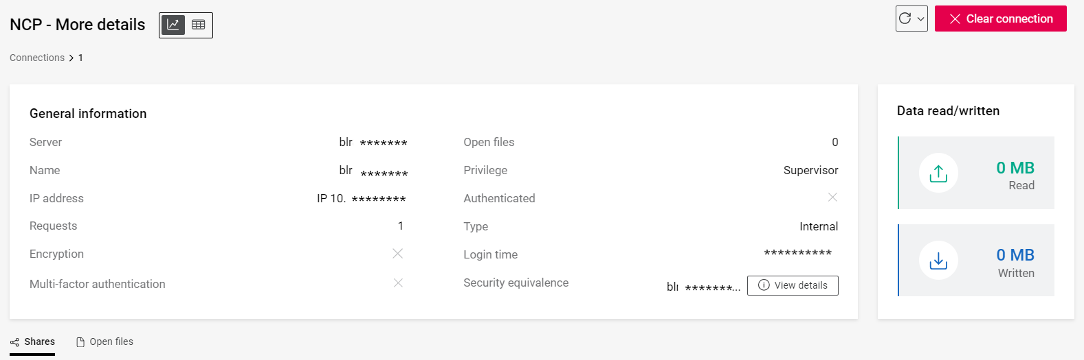 You can view the details of an NCP connection using the more details option. This includes general information, data read or write, list of related shares, and open file information.