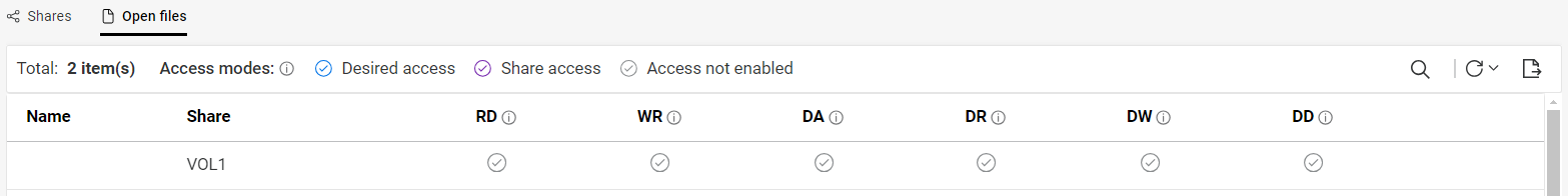 The page displays the list of open files accessed by the CIFS connection. For more information on access modes, see What are the various access modes for open files?.