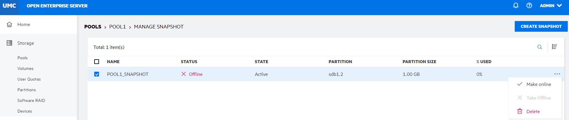 Make Offline: This option makes the selected pool snapshots and its associated volumes inaccessible through the pool list. It does not delete the data in the volumes.