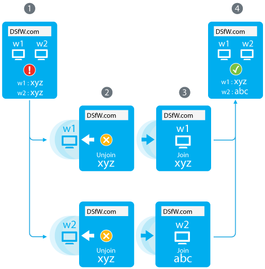 Rejoin the second workstation to the domain using a unique name. You must first unjoin the workstation from the domain and then join the workstation with a unique name.