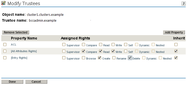 The [All Attributes Rights] and [Entry Rights] properties should automatically be listed. Add them if they are not present.