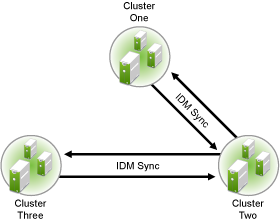 A preferred method is to make Cluster One an Identity Manager synchronization master. Cluster One synchronizes with Cluster Two and Three. Cluster Two and Cluster Three both synchronize with Cluster One. This is illustrated in Figure 6-2 below.