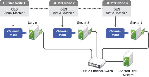 In Figure 3-3, the NCS cluster nodes are all virtual machines. Each node is hosted on a different VMware host. All nodes are running the same version of the OES operating system.