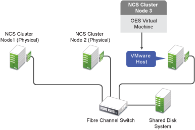 In Figure 3-2, the NCS cluster nodes are all virtual machines. Each node is hosted on the same VMware host. All nodes are running the same version of the OES operating system.