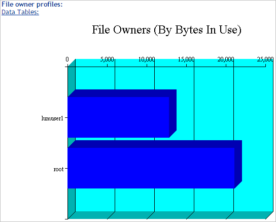 The Profiles portion of the inventory report graphically displays information about the volume. Graphical profiles are displayed by size in bytes and file count for the following categories: