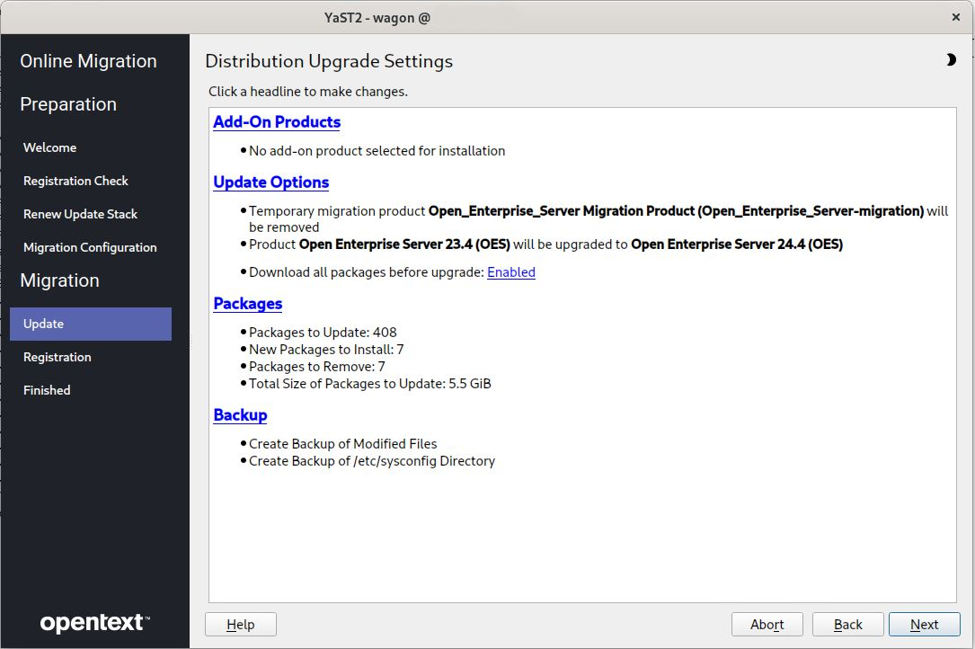 WARNING:If Product Open Enterprise Server 23.4 (Open_Enterprise_Server) will be upgraded to Open Enterprise Server 24.4 (Open_Enterprise_Server) is not displayed, click Abort and roll back the server.