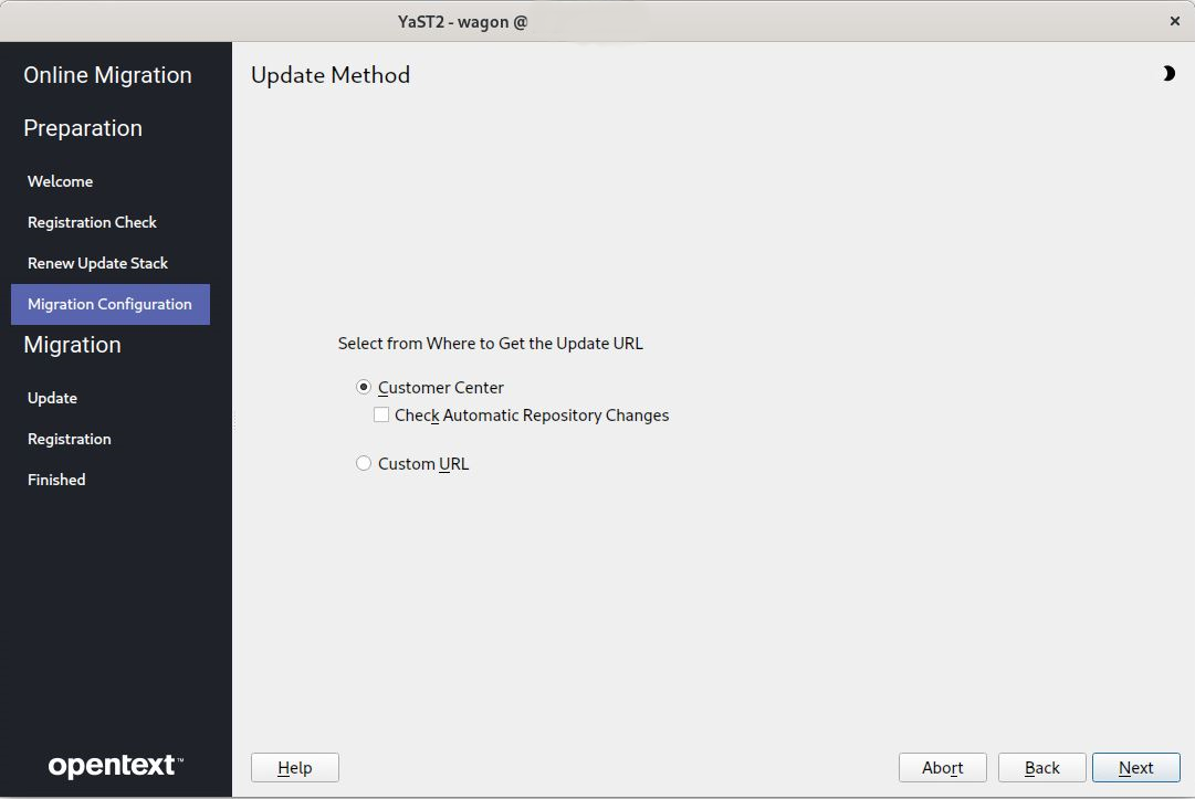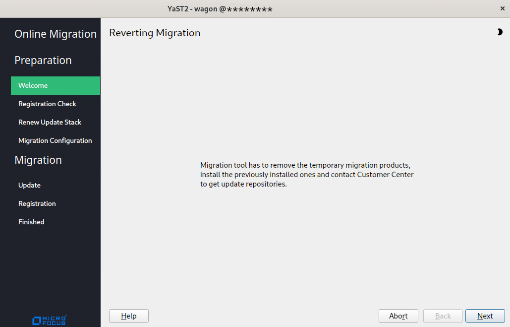 NOTE:If the repositories are not enabled, click Back > Next and redo the Micro Focus Customer Center registration until it is successful. If you are not able to do a successful Micro Focus Customer Center registration after multiple attempts, abort the process and roll back the server. For more information, see Section 5.6.4, Rolling back the Server in the Middle of a Wagon-based Channel Upgrade.